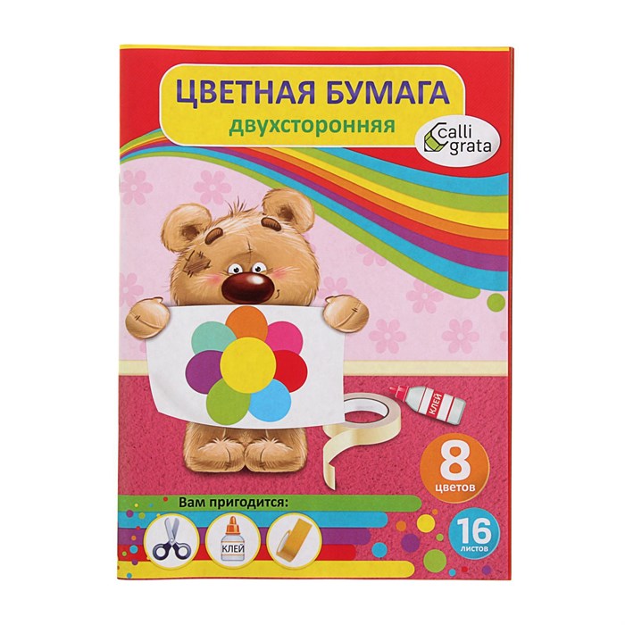 Бумага цветная двусторонняя А4 16 листов, 8 цветов "Плюша" 45 г/м²